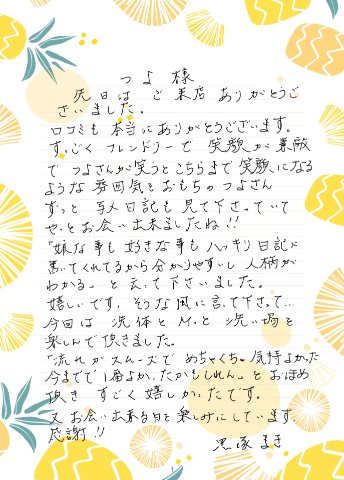 日記の内容を他のお客様や女の子達が見て「もしかしてあの人かも?」と言う内容を書く事はなるべく避けています。色んな立場、事情でお店に来られるお客様が不安にならないように信用していただける行動を取りたい。