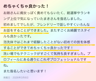 また、プレイの内容を具体的に書かれすぎると普通に恥ずかしいですよね。中にはそれがお楽しみの方もいらっしゃるかもしれませんが、それはプレイ中に満足させられる自信がありますのでご了承くださいませ。