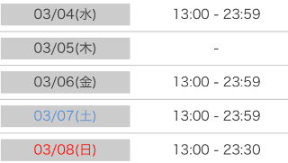 3/6(金)13:00 〜 0:00 まで います