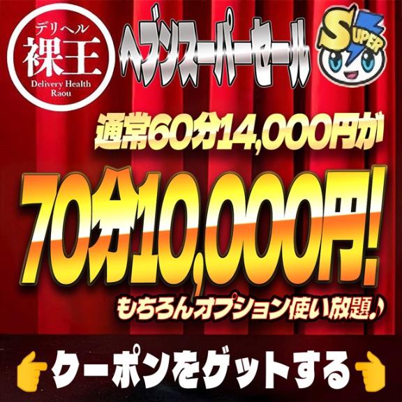 店長涙目70分10,000円のスーパーセール開催中♪ 博多エリア屈指の満足度を誇る【裸王】誕生 楽しいイベントに丁寧な接客、さらにオプションも豊富で楽しみ方は自由自在。 癒しも刺激もどちらも叶う、安心して通えるお店です。
