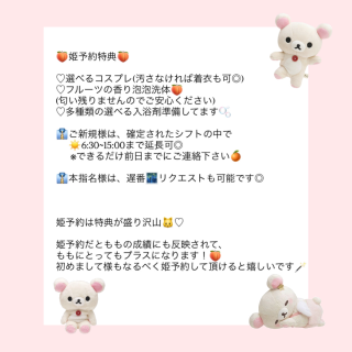 ・姫予約でご予約下さる初めまして様は"ロー♡ョン風呂希望"の記載をお願いします。ネットからのご予約の初めましてのお兄様はロー♡ョン風呂はフロントで申告してもご利用できません🙏