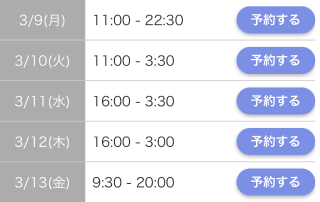 営業/10:00〜翌05:00(最終受付) 定休日/無し