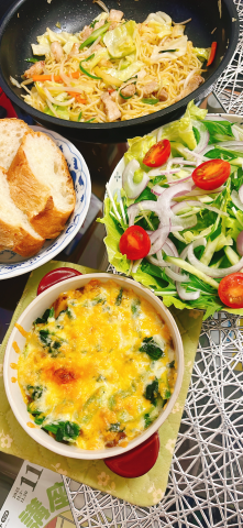 今日のお夕飯は、冷蔵庫と冷凍庫の余りの材料を、使って作りました★塩焼きそば★サラダ★ミートグラタンをバケットにのせて