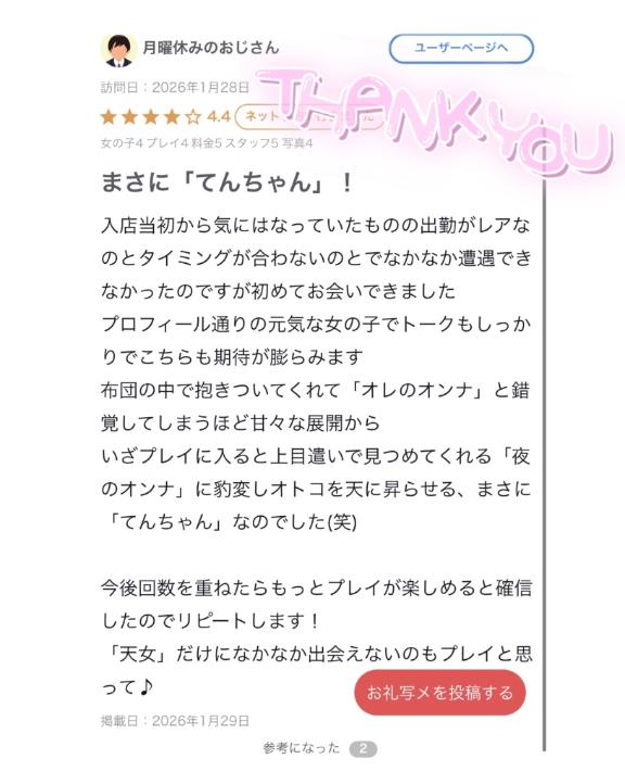 久しぶりだったけど今日あえてよかった〜😭毎回色んなお話してくれるから楽しい☺️いつも色々褒めてくれるけど恐縮💦Tさんの好みの女の子ならそれだけででゆりかは嬉しいな✨☺️