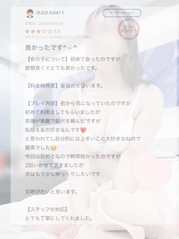 お会い出来たお兄様方とエッチな時間を共有しながらも、普段の疲れやストレスを忘れ、至福の時間を過ごせるよう頑張りたいと思いますので、