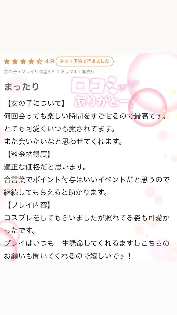 | 口コミ割引き実施中!! ご利用後に当店エンジェル達にお客様からの口コミ投稿を頂く前提で何とも嬉しい表示価格から〝500円割引き〟を致します 〇プレイについて 【Angelとご対面♡】→【ナース服に変身♪】→【温かいホホバオイルでお客様のムスコ様を癒します】恋人のような空間で女の子から乳首のお触りが始まります!!超絶密着施術でどこのお店でも味わえない快感がお客様の全身で堪能することでしょう! ※60分コース以上は、60+30分等のロングコースも可能です。 ※混浴はございませんので女の子到着までにシャワーを浴びてお待ち下さいませ。 ※ご自宅派遣の場合、ベッドに敷くバスタオルをお貸し頂きます。 | |