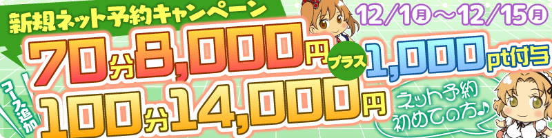 ![]() 当店でのネット予約が初めての方、どなたでも『70分8,ooo円&1,ooo Pt進呈🌟』いたします!🤩 ※当店でのネット予約が初めての方はどなたでもご利用可能です。 ※当日のご予約限定です。 ※ご指名の場合は別途ご指名料を頂戴いたします。 ※ご自宅でもご利用可能! ※ご利用完了後に2,000ポイント付与させていただきます。 ※その他割引き、メルマガ特典との併用は出来ません。 | |