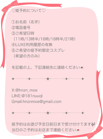 ご予約はもえを通して予約する『姫予約』がモチベーションアップや成績に繋がるため嬉しいです♩