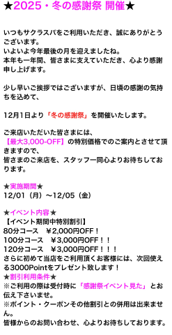 もうサクラスパ、現在はフルで出勤はしておりませんが、こんな楽しいお店辞める訳はございませんので、12月もご予約合えばお会いしましょう。お待ちしてます🌟
