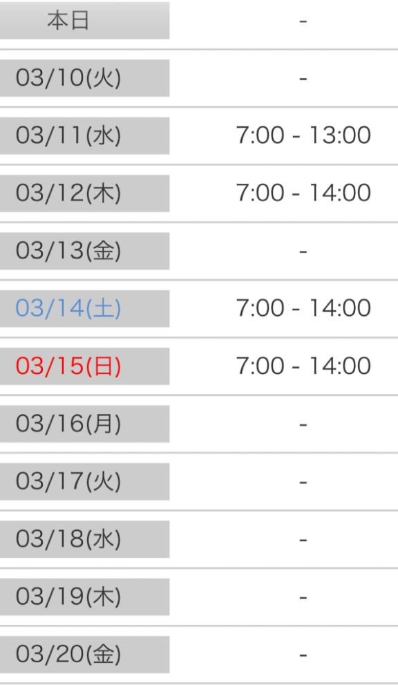 3/10(火)7:00 〜 14:00