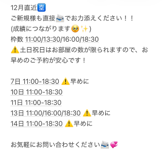 12月はお部屋が例年1年で1番早く埋まってしまう時期だそうなので事前にご連絡💌頂ければと思います💛