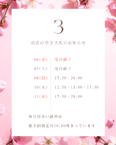 先の日程で姫予約でのご来店可能です🌸
