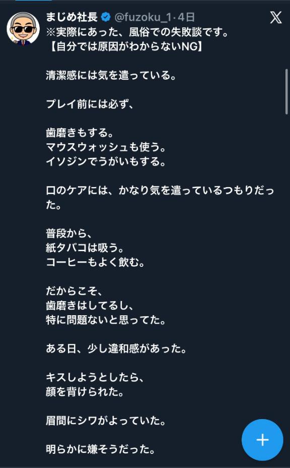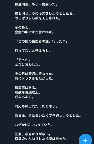 数日後、また会いたくて予約しようとした。なぜかNGになっていた。正直、心当たりがない。口臭のやんわりした指摘はあった。でも、それだけでNGになるものだろうか。さすがにそれは考えすぎだとも思う。他に理由があったのかもしれない。