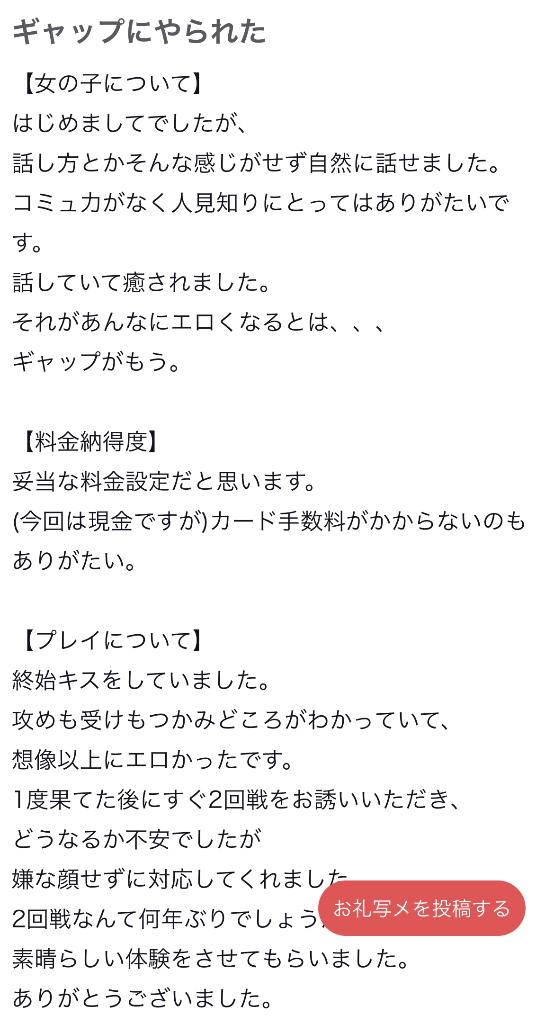 | 基本プレイ | オリジナルセーラーコスプレ2種, Dキス, 全身リップ, 生フェラ, 玉なめ, 指入れ, 69, 素股, 口内発射,笑顔 |